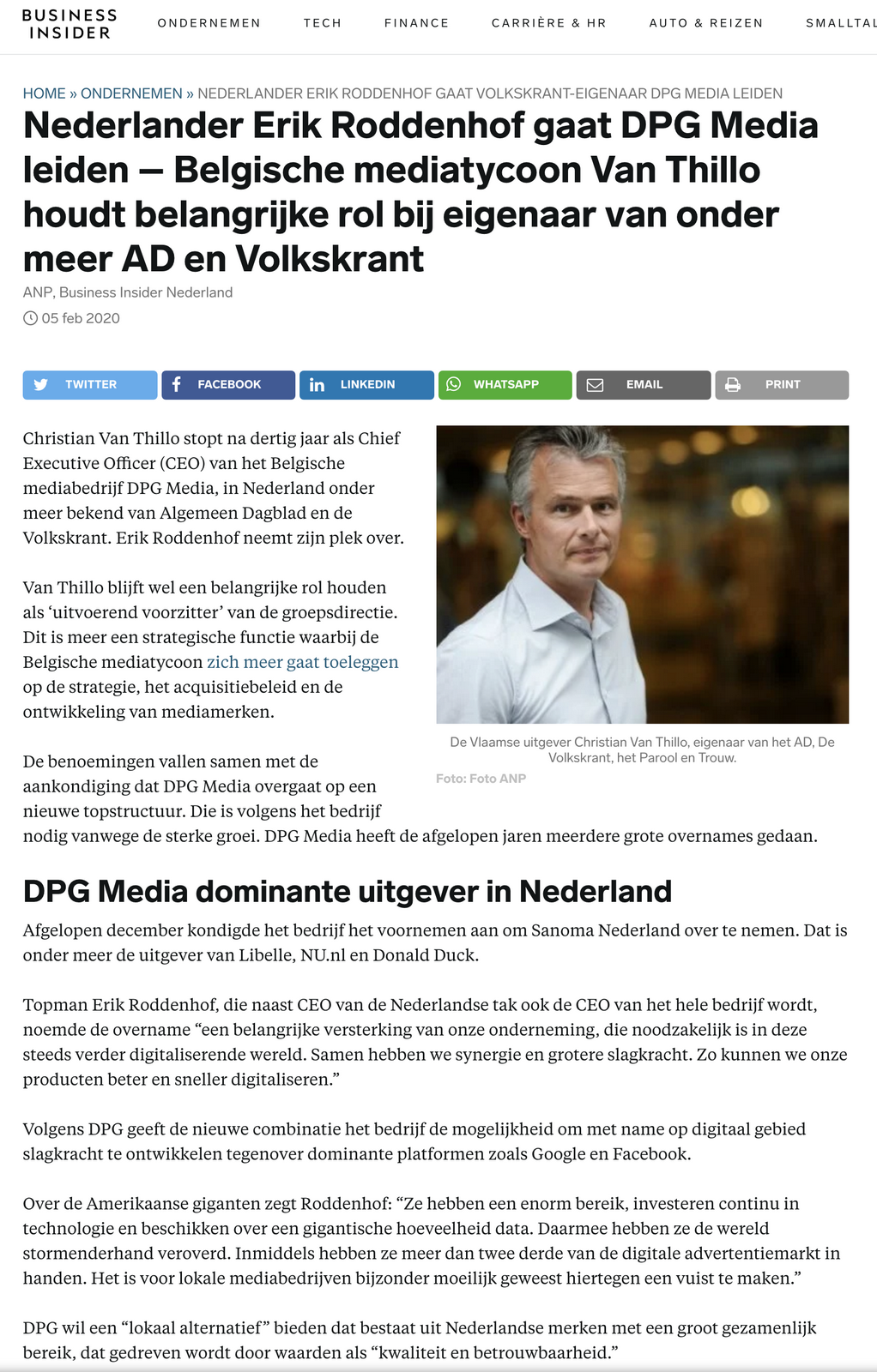 DPG media en Mediahuis de twee grote media uitgevers in volledig bezit van die hufter. Code oranje in België (Onderkomen van de EU). Maar: "Wie schrijft, die blijft!"